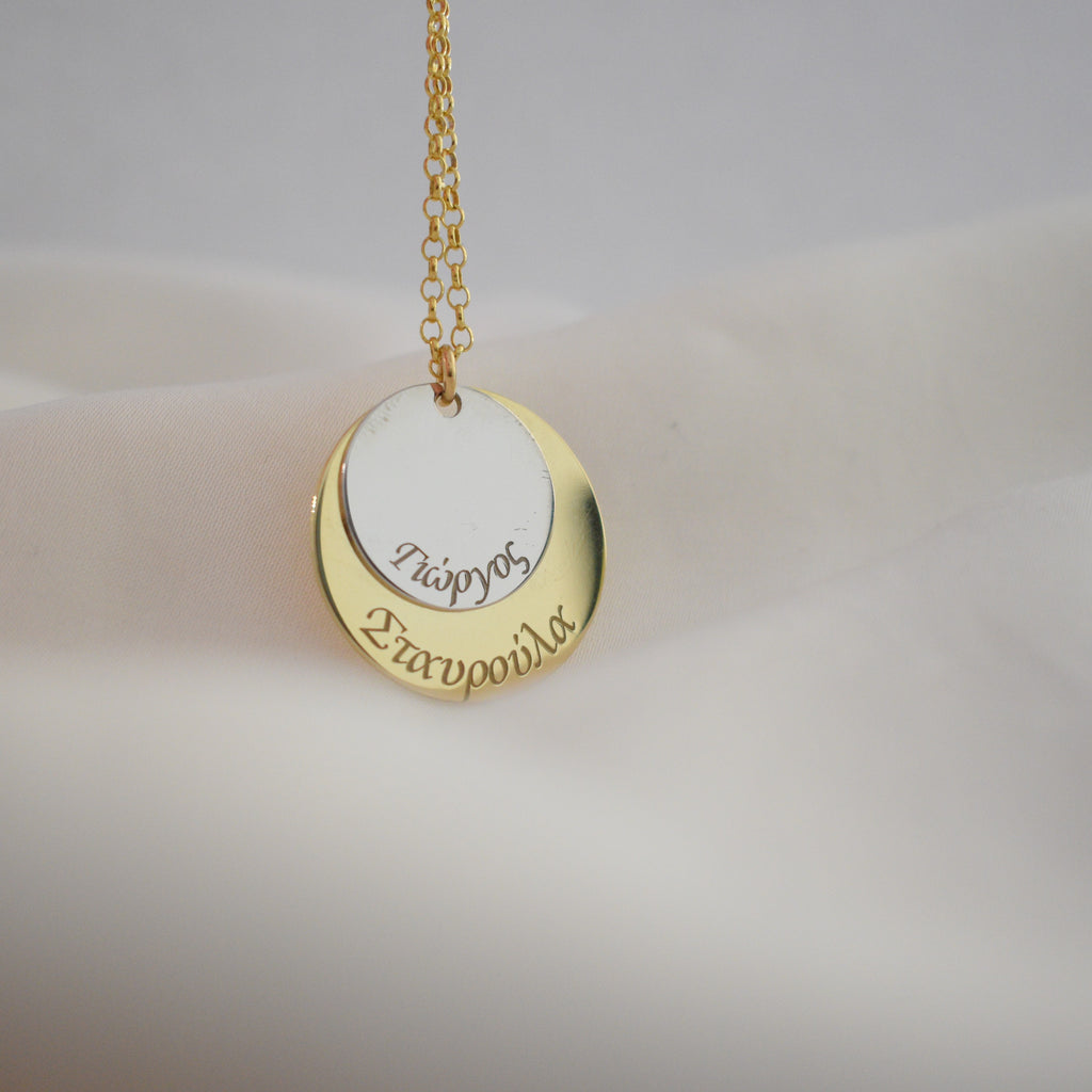 Το Two Circles Κολιέ personalized είναι ένα διπλό κολιέ που θα χαράξουμε τα ονόματα που εσύ επιθυμείς στην κάθε στρογγυλή πλακέτα. Από ημερομηνίες μέχρι τα ονόματα των μικρών σου, αυτό το κόσμημα θα έχει την δική σου προσωπική υπογραφή!