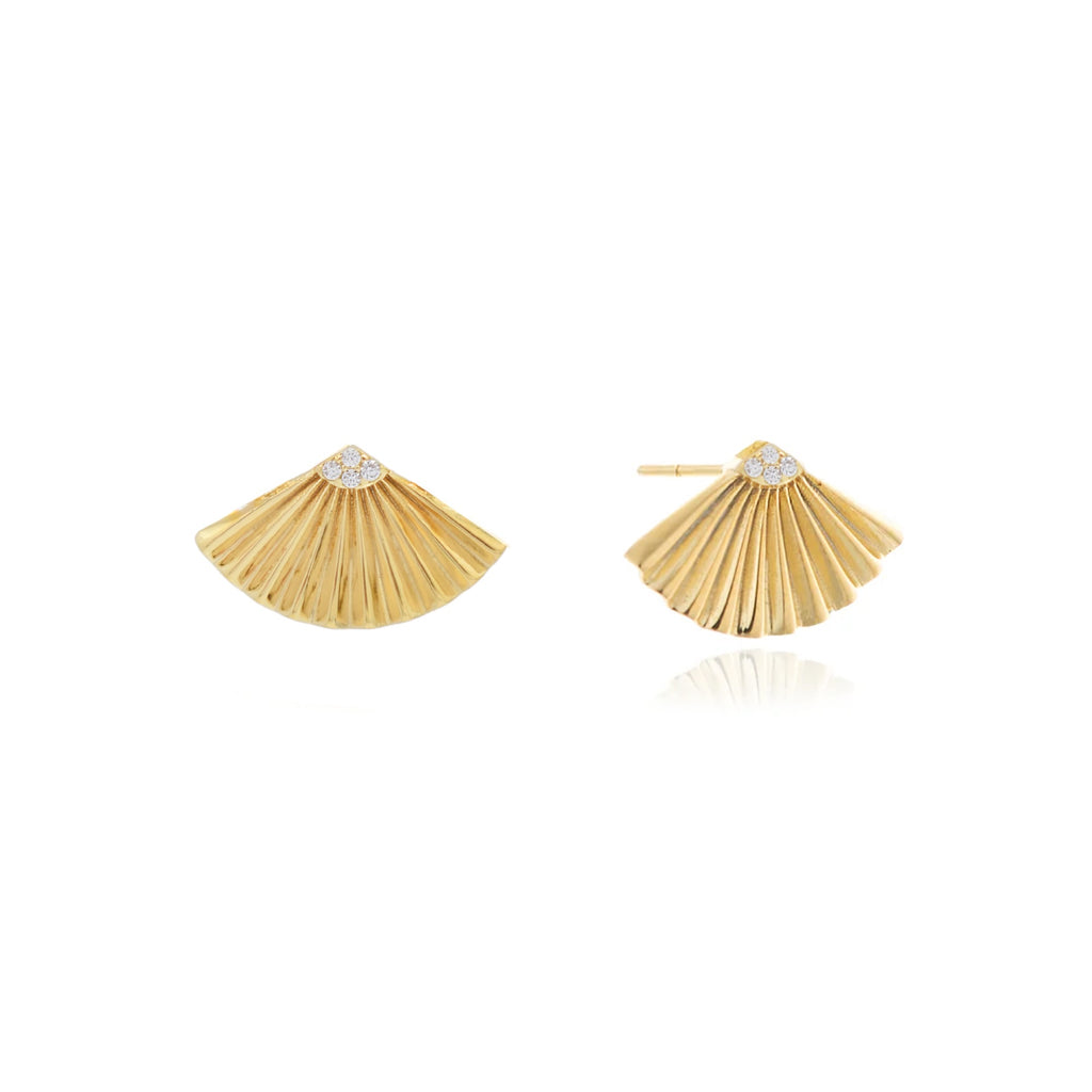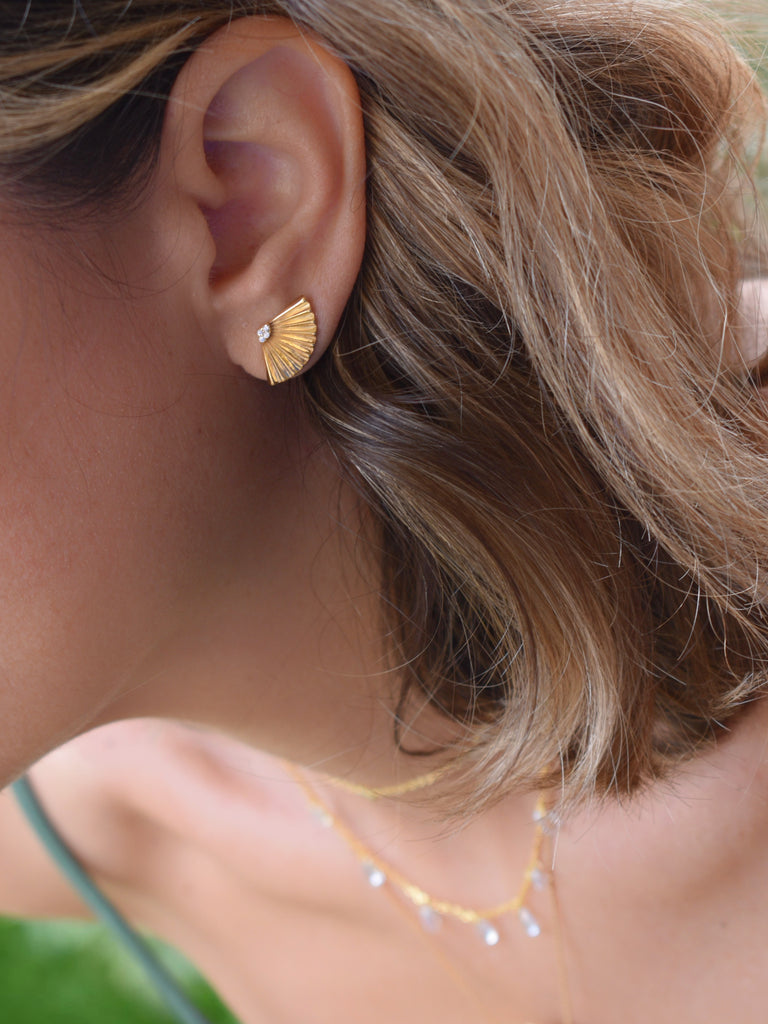 Τα Eos Little είναι το κόσμημα που αιχμαλωτίζει την πρώτη λάμψη της ημέρας. Εμπνευσμένο από την Ηώ, τη Θεά της Αυγής, τα σκουλαρίκια σε σχήμα κομψής βεντάλιας ανοίγουν με χάρη, σαν το φως που απλώνεται αργά στον ορίζοντα. Στα άκρα τους, οι λευκές λαμπερές πέτρες φωτίζουν διακριτικά κάθε κίνηση, δημιουργώντας μια απαλή, αιθέρια λάμψη πάνω στο δέρμα.