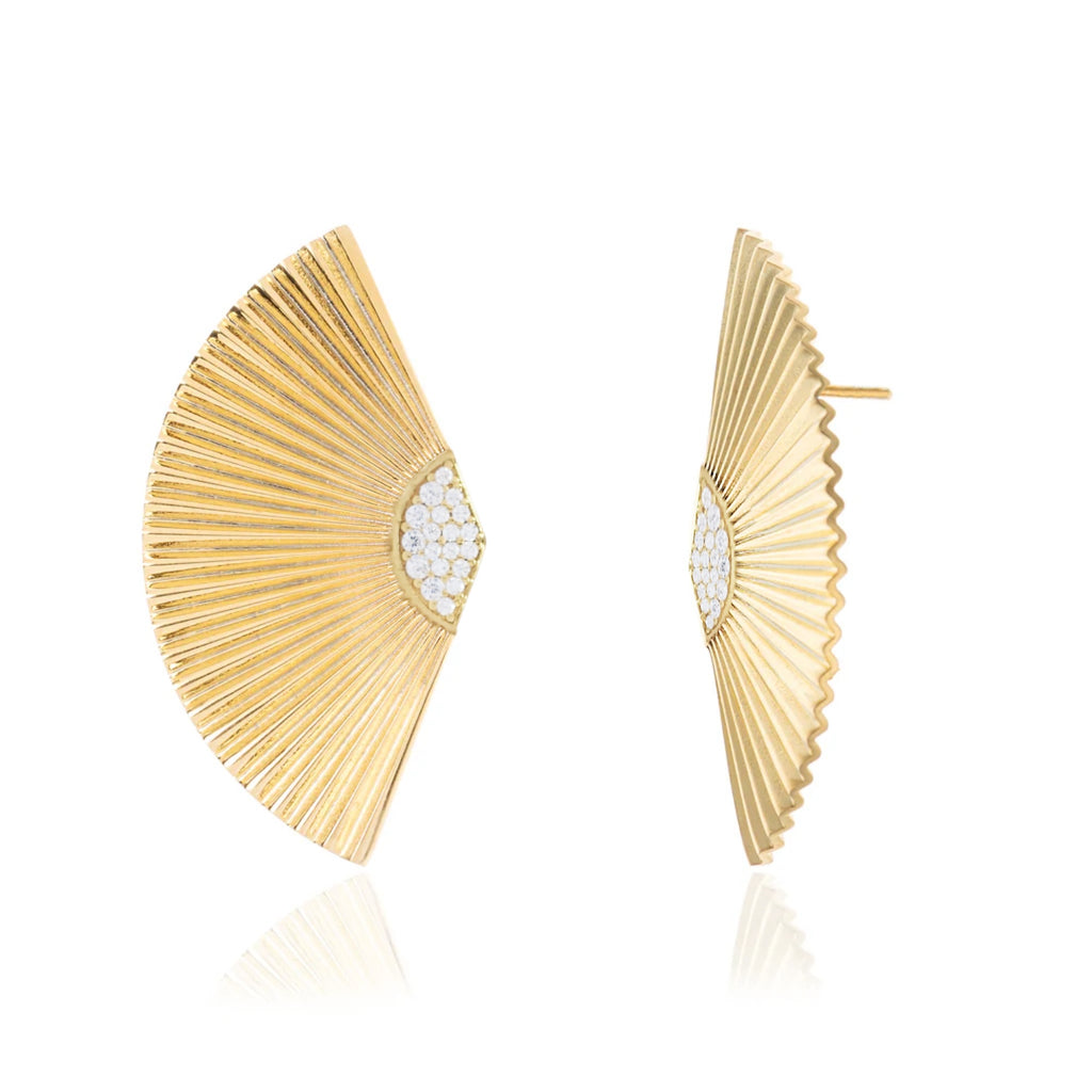 Τα Eos είναι το κόσμημα που αιχμαλωτίζει την πρώτη λάμψη της ημέρας. Εμπνευσμένο από την Ηώ, τη Θεά της Αυγής, τα σκουλαρίκια σε σχήμα κομψής βεντάλιας ανοίγουν με χάρη, σαν το φως που απλώνεται αργά στον ορίζοντα. Στα άκρα τους, οι λευκές λαμπερές πέτρες φωτίζουν διακριτικά κάθε κίνηση, δημιουργώντας μια απαλή, αιθέρια λάμψη πάνω στο δέρμα.