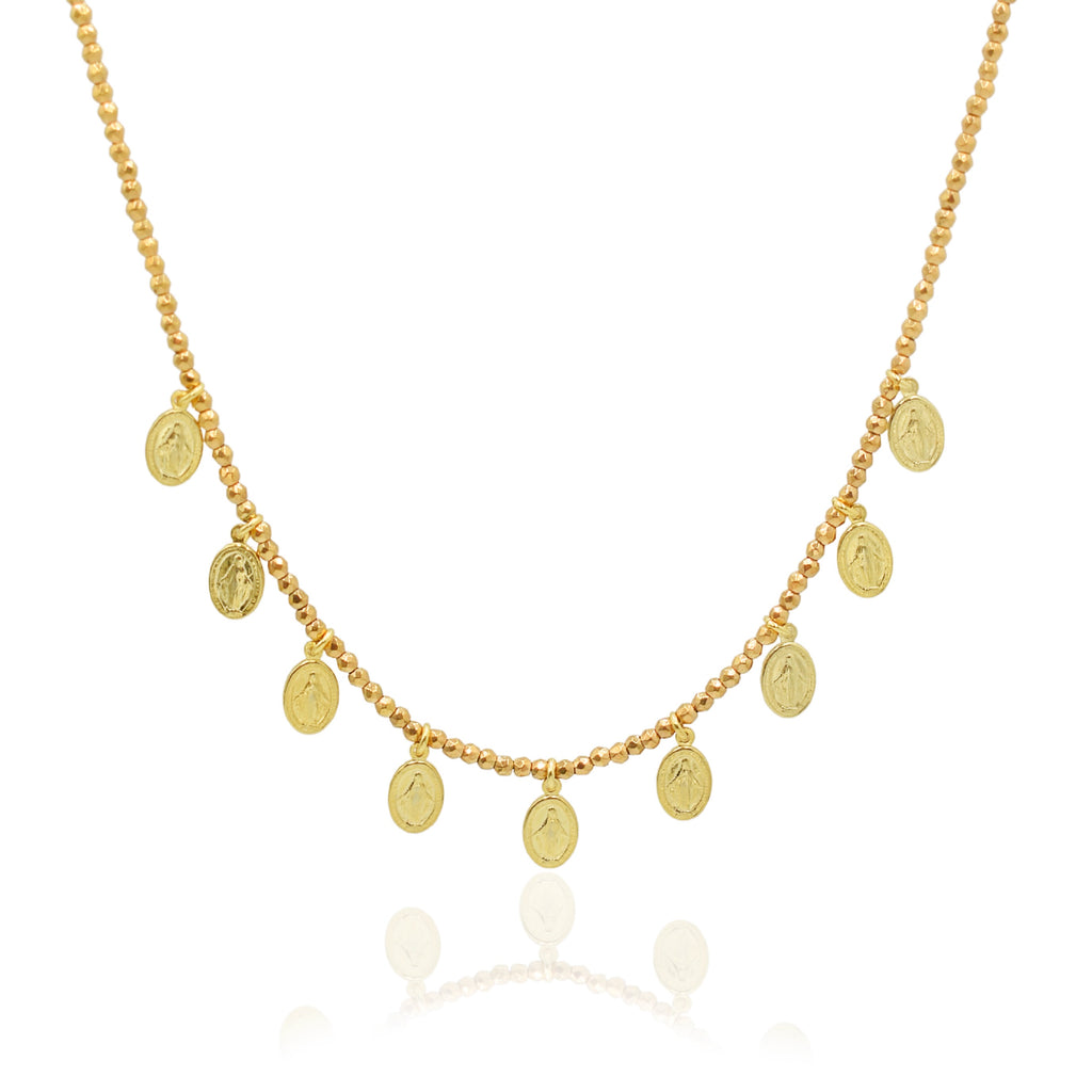 Κράτα την ελπίδα κοντά σου με το Hope, ένα ιδιαίτερο κολιέ γεμάτο μικρές Madonna, που λειτουργούν σαν διακριτικά φυλαχτά προστασίας και καλοτυχίας. Κάθε λεπτομέρεια του κοσμήματος ακτινοβολεί λαμπερή ενέργεια, στολίζοντας τον λαιμό σου με μια αίσθηση ασφάλειας και μαγείας.